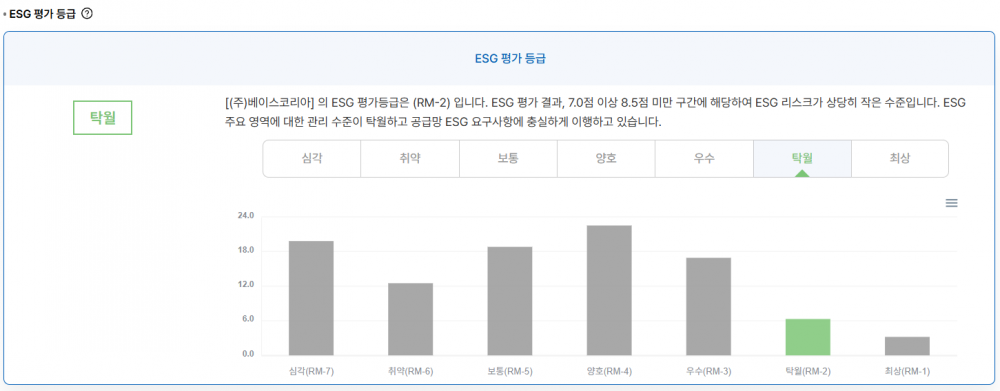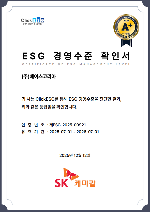 베이스코리아는 (주)에스케이케미칼 원청서 자격으로 시행한 2025년 ESG 경영평가에서 탁월(A+) 등급을 획득 하였습니다.